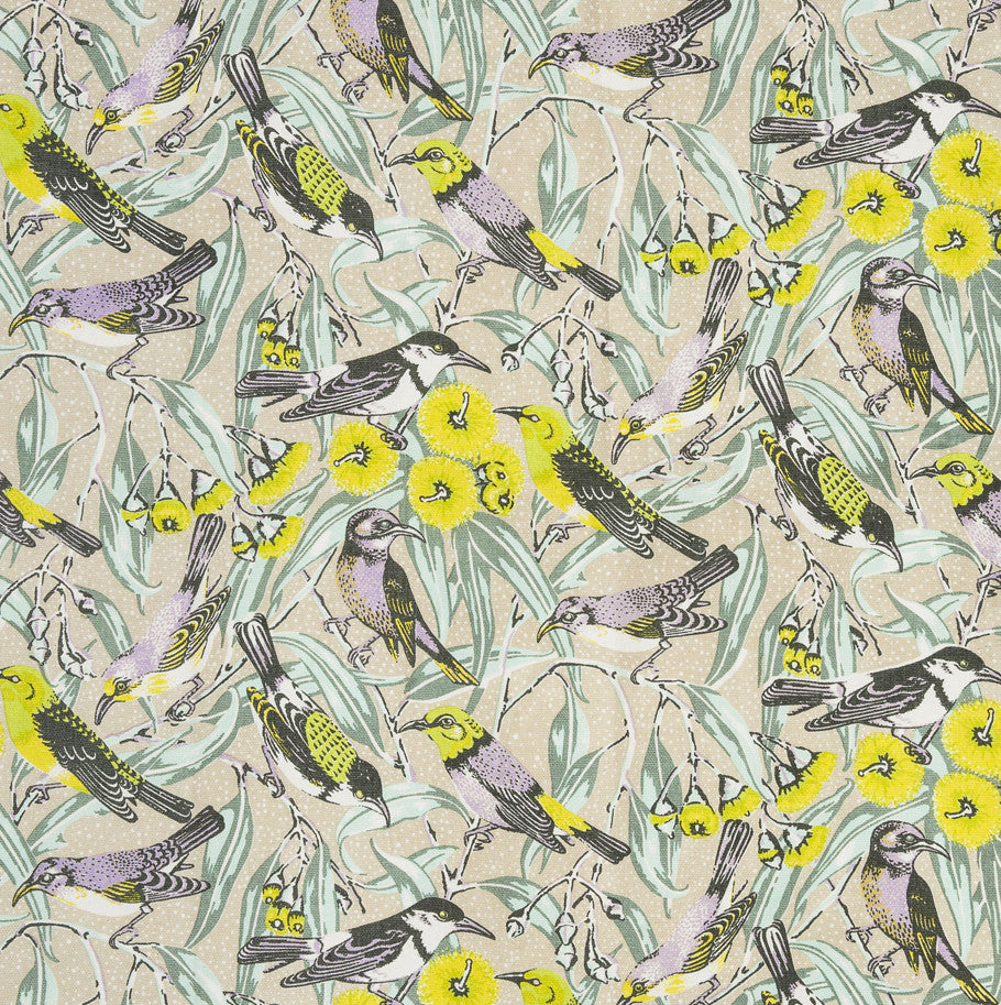 The Flowering Gum - Beige print features Bruce’s illustrated honeyeater birds feasting on the nectar of a feathered flowering gum nut. If you look closely, there are different varieties of honeyeaters on the backdrop of a subtle organic polka dot.