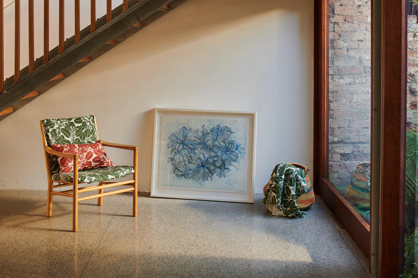 Often humming with bees, the Stringybark tree is one Australia’s most robust, varied and valuable trees. It was the first eucalypt to be scientifically named, and in fact gives us the name Eucalyptus. The Stringybark print is a creative nod to The Grampians of Western Victoria and the oblique shaped leaves of this magnificent tree. Available in the palette of the earth - clay and indigo blue.